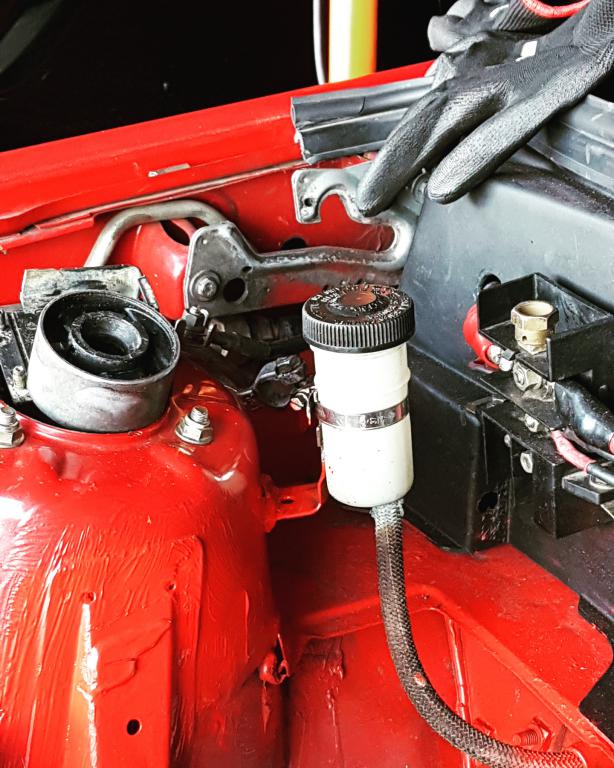 Haven't made much progress lately. Only thing of note was relocating the clutch reservoir from the side of the strut tower to the back of it where the battery tray has been cut out. Cut the old bracket and welded it into the new location