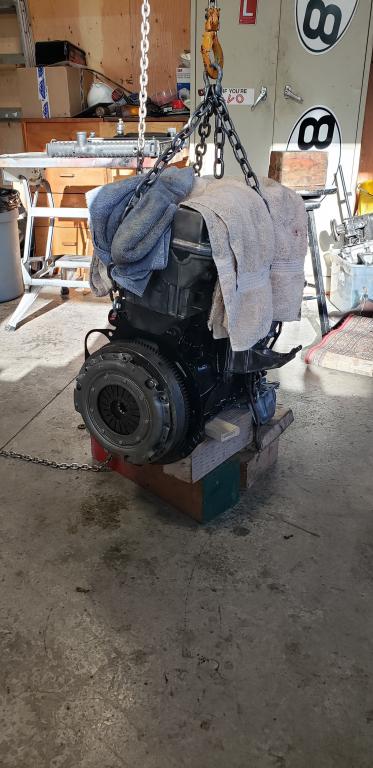 Here's the part where I had to buy a new subframe because the m10 subframe doesn't work with m42 motor mounts. I had filed out my m10 subframe to make set of e36 mounts fit (thinking they were e30 mounts - thanks RockAuto) and once I realized this I decided to start fresh with a new correct subframe. Had to strip and paint teh new subframe and then drop the old one and wrench in teh new one. Four hours from start of prep to torqued own. The hoist helps a *LOT*.