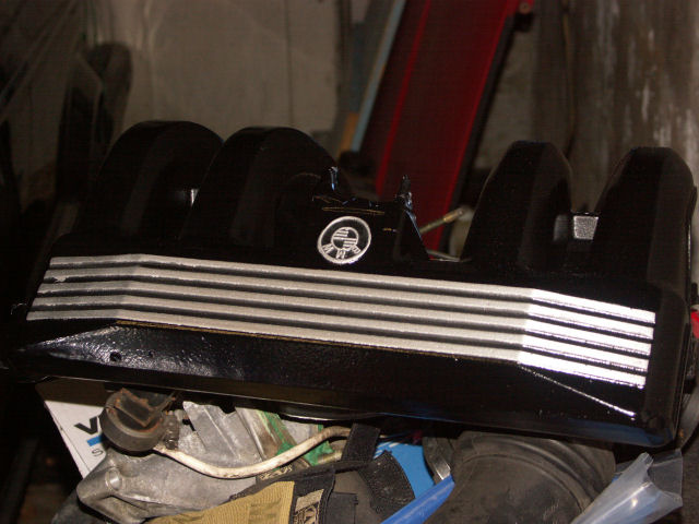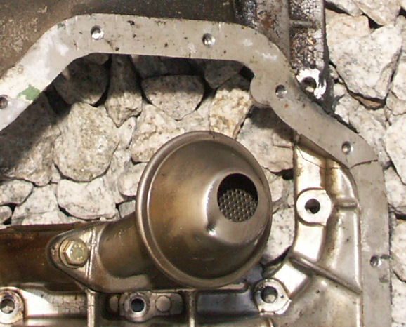 And I pulled off the M42s damaged upper oil pan, custom-tailored by the previous owner when he curbed the lower pan. Note the threaded dent in the oil pickup housing caused when one of the two upper pan bolts which had worked their way loose prior to the curbing got pinched when the pan shattered.