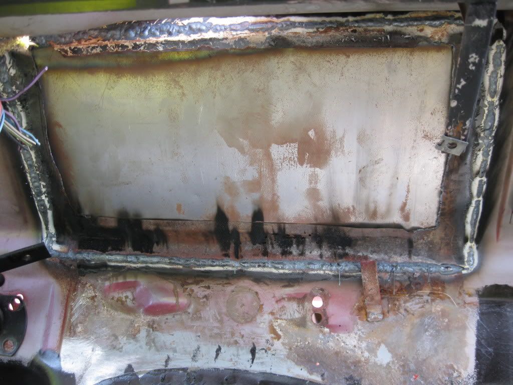 So, the heater box cover is a little goofy, I didn't expect that he would butt weld the thin sheet metal, but its lap welded and pretty gnarly, so I'll be cleaning it up. Just take that into account for that picture. Going to cut away the useless lap of old sheet metal down to the weld, smooth out the weld some from the inside, and try to make the transition smoother on the outside from the surrounding metal over the weld bead.
