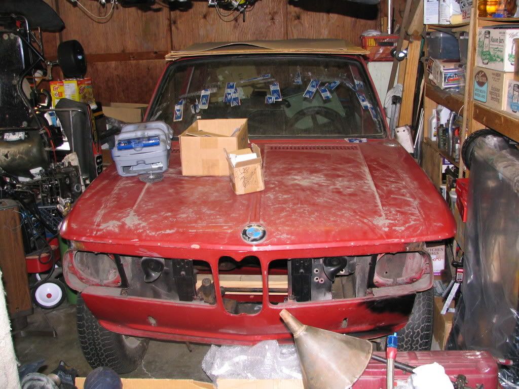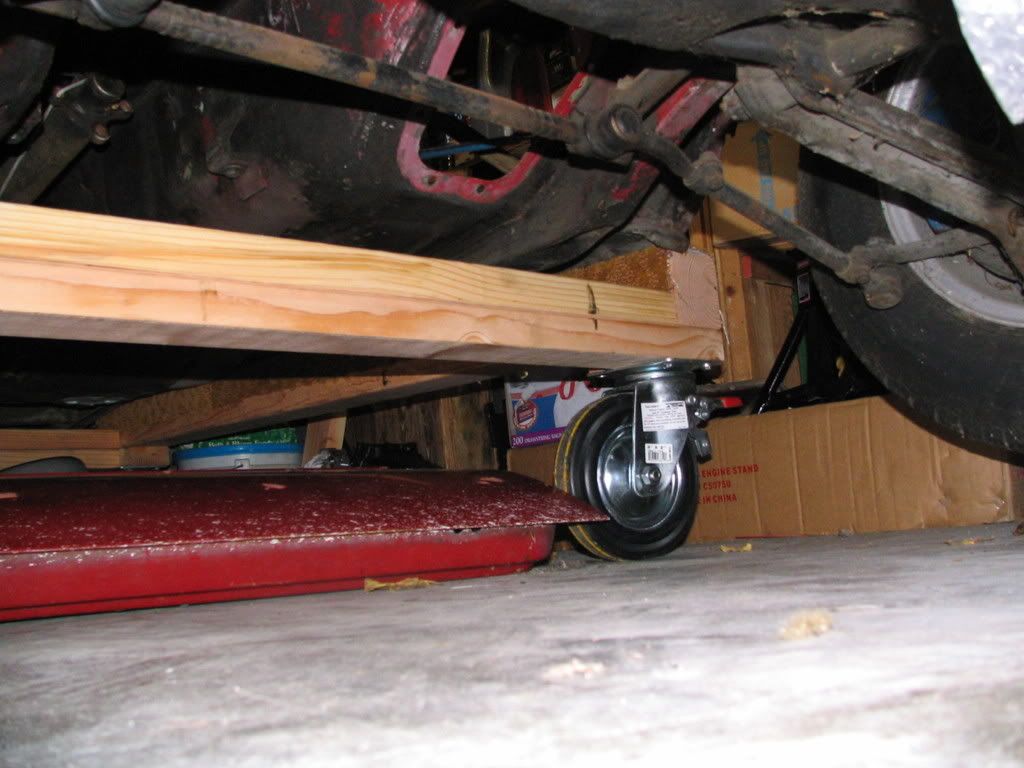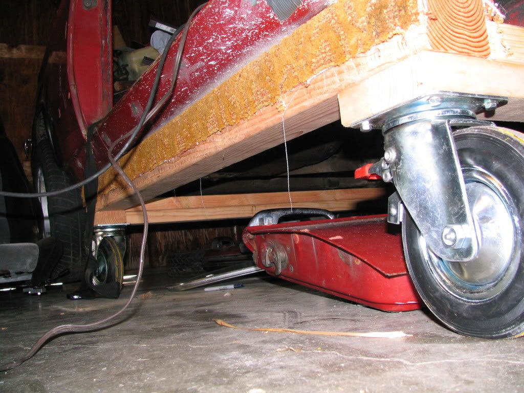 How the car sits in the garage currently. It's a tight fit but there's just enough room to work on it. When I replace the nose, I have plenty of room to push it out of the garage door (5' or so) before the dolly wheels fall onto the driveway. The front two wheels have brakes on them anyway though.