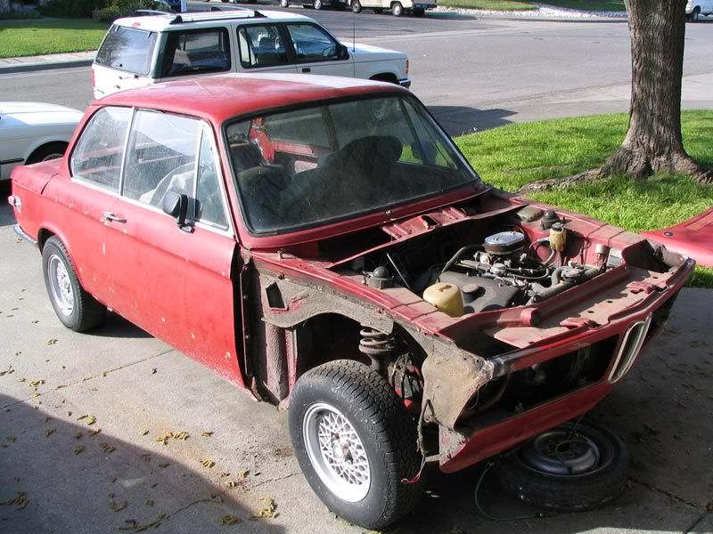 Well, here's a few quickie pics of what the 02 looks like now, or at least close to. It currently doesnt have the trunk lid on it anymore (it is covered with plastic sheet taped tight and a junky car cover, so it's not getting wet), rear side windows are out, but the hood actually IS sat on top where it would be. Once I can get it in the garage I'm building a dolly for it ASAP, tearing off all the original suspension and probably selling it off cheap, and going at the body work, including removing all the road grime and crap from the bottom to bare metal to paint it again and put down some WURTH undercoating, then paint it black. The M10 and tranny need to go still, that's one thing I've been seriously slacking on, that is getting rid of all my spare M10 stuff. Anybody locally need a cheap running M10? I also have lots of other stuff that could be used as cores to rebuild :)