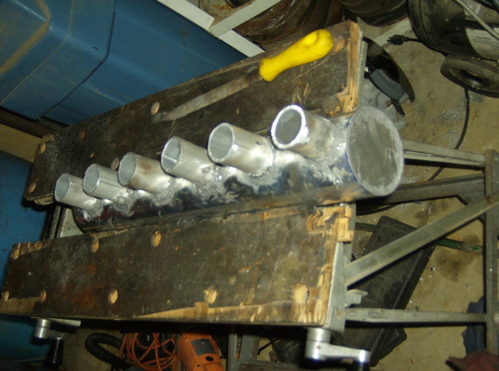 Ok plenum fabbed up. I used some aluminum brazing rod to connect the runners to the large pipe, and got a good solid connection on 3 of them, but the other 3 popped loose so I doubled everything up with a layer of JB weld also. Just waiting for the epoxy to dry, then I have to sand it all smooth, prime and paint it tomorrow.