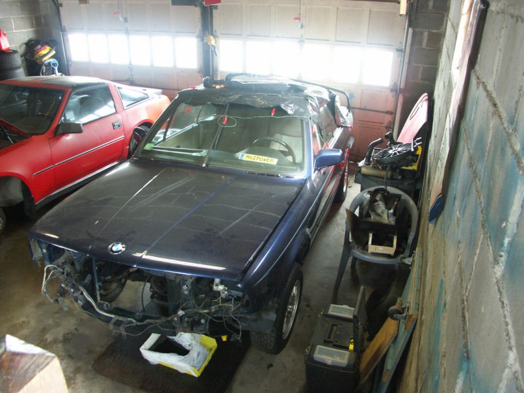DK- No thread yet, I don't think it's worthy. The car itself is Mauritiusblau Metallik, has about 155K on it, chipped, 4.27 open diff, M-short throw, Eibach Pro Street kit, 17s, nearly mint sport natur interior. It's been sitting for about 6 years off the road following the PO curb to the oil pan shot. Funny thing is, I bought it two years ago, with no money to do anything with it. I tinkered around a little bit and got that shit running with nothing more than a battery charge. As I probed more, I realized it leaked lots of oil and coolant, it needed control arm/tie rod/sway bar links so the fun began. So I found a second job this year to fund it. I'll be doing the A/C delete, fan clutch delete, new gaskets, water pipe, "mess under the intake" delete, etc. Even when it ran like shit, it still layed good rubber. A pic as it sits this second: