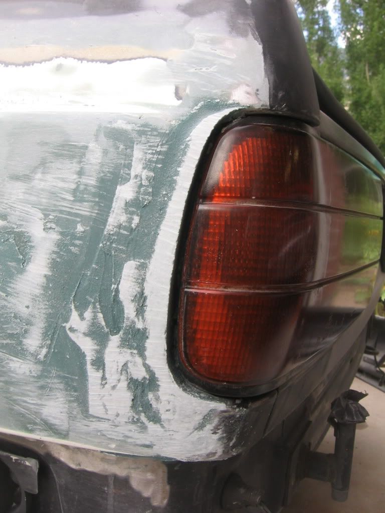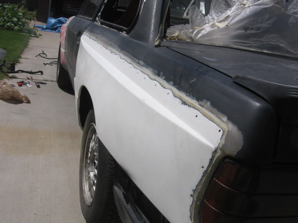 The drivers quarter is bonded on and using short hair fiberglass to smooth the lines.