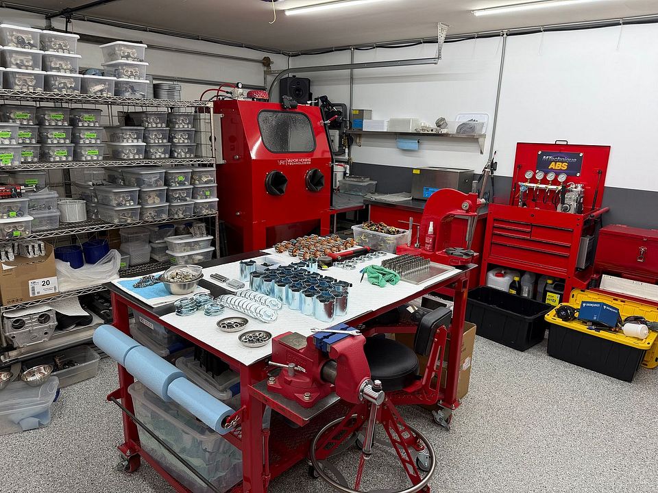 Overall but from another angle. You can see the vapor honing cabinet, central work table with arbor press, the core storage cabinet, ABS test bench, and vibratory polisher machine. The stainless shelf is hospital surplus, NSF stainless... not chromed wire that will eventually rust.