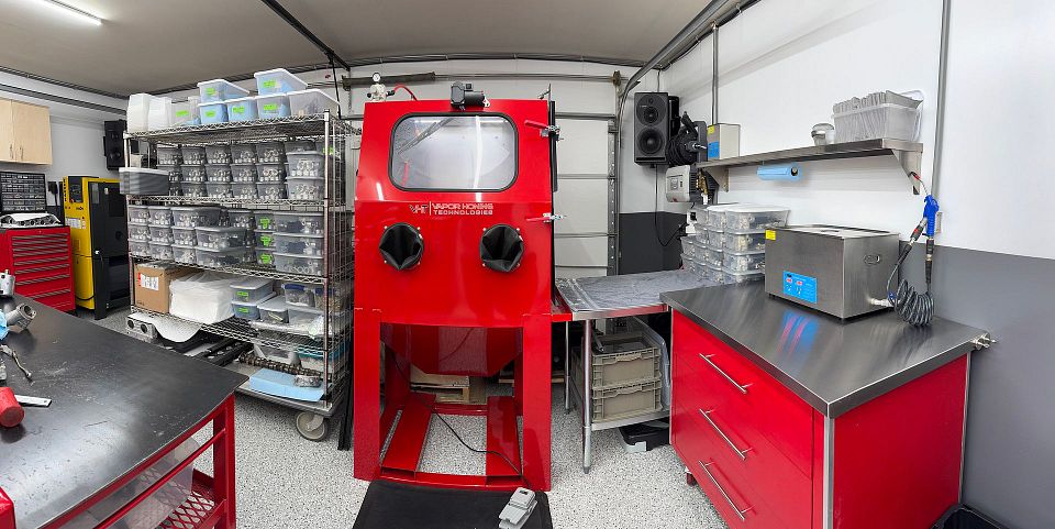 Vapor honing cabinet is the VHT VH1000 - Custom ordered in 100% Stainless Steel chassis with custom red powdercoated finish. VHT hated me for this, I'm certain of it.
