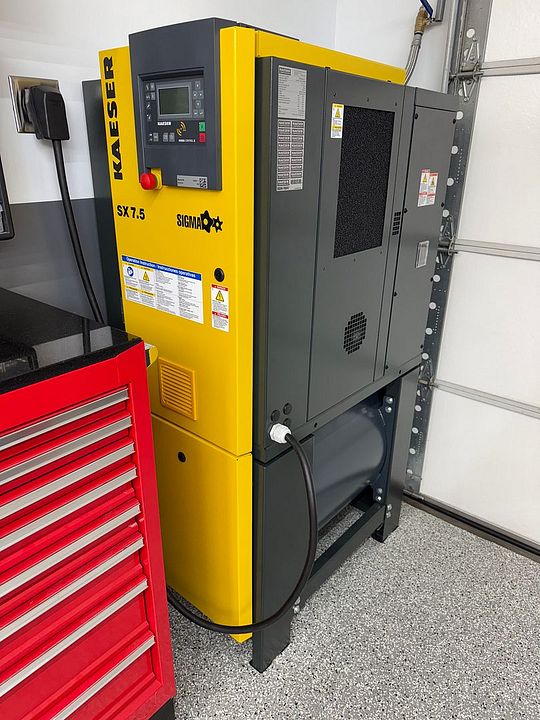 Air Compressor is a Kaeser Aircenter SCX7.5 (230v single phase, 28cfm @125psi - or about 35cfm at 90psi where I use it)