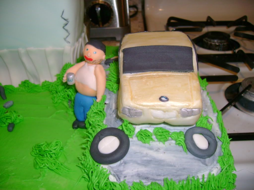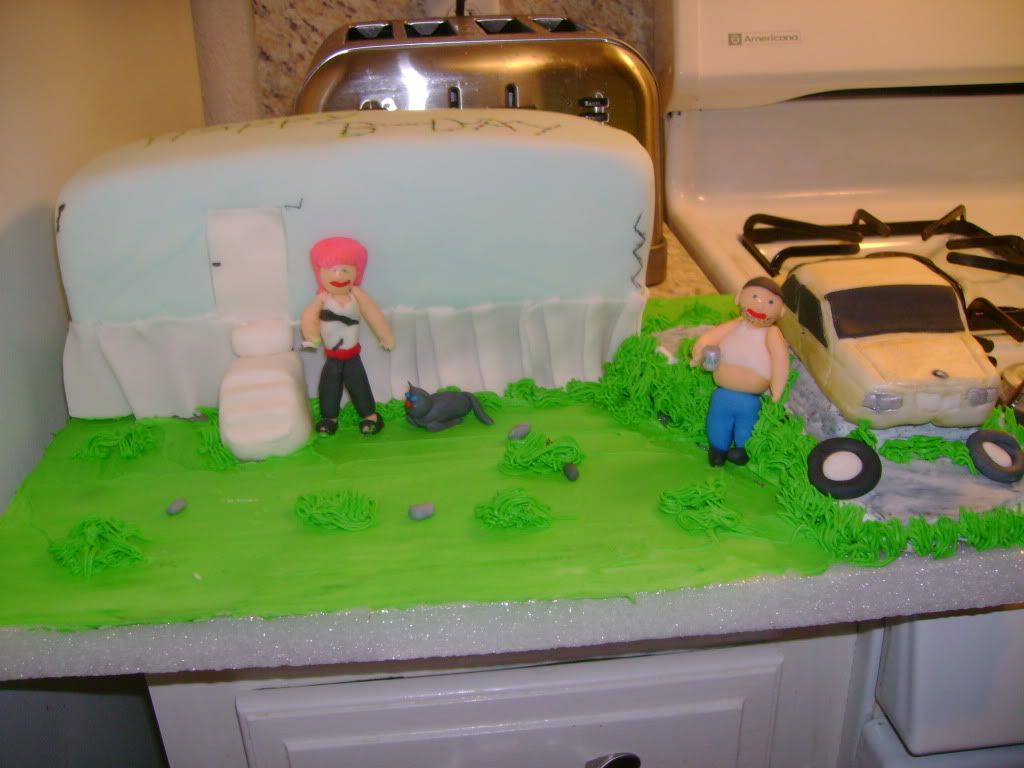 One of our good friends is a baker and made us (the girlfriend's b-day is in a couple days) this cake. We had a "white trash" party, hence the theme for the cake.