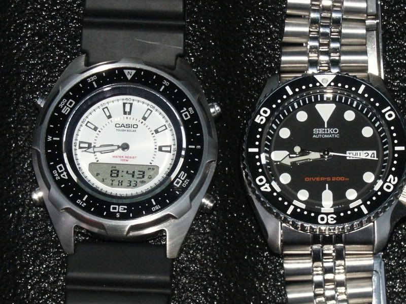 yeah I know I just bought a new Analog/Digital (quartz of course) Casio Diver to use for work today ( I have to have a Digital Stop watch for my job) this one is solar charged. Now I have 3 Casios that are Ana/digi for work, 2 divers and a G-shock. Fuck I need to stop looking at the damm things