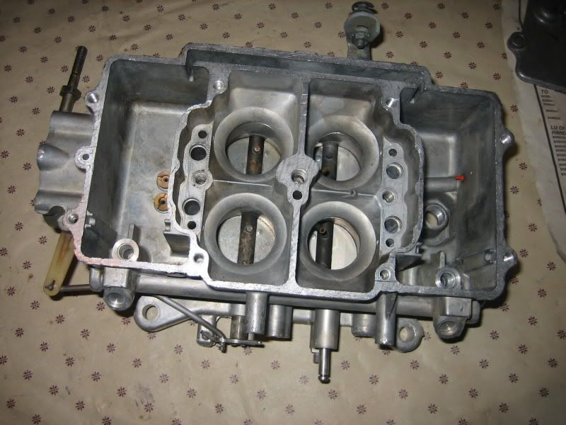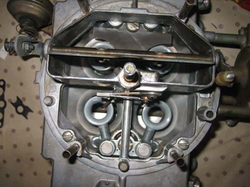 FINALLY got it going. 3rd time the charm for tearing the carb down. What happened was I forgot to put the economizer washer/gasket in. Without that in all the fuel from the primary chamber would just leak down into the intake, dumping all the gas in at once.