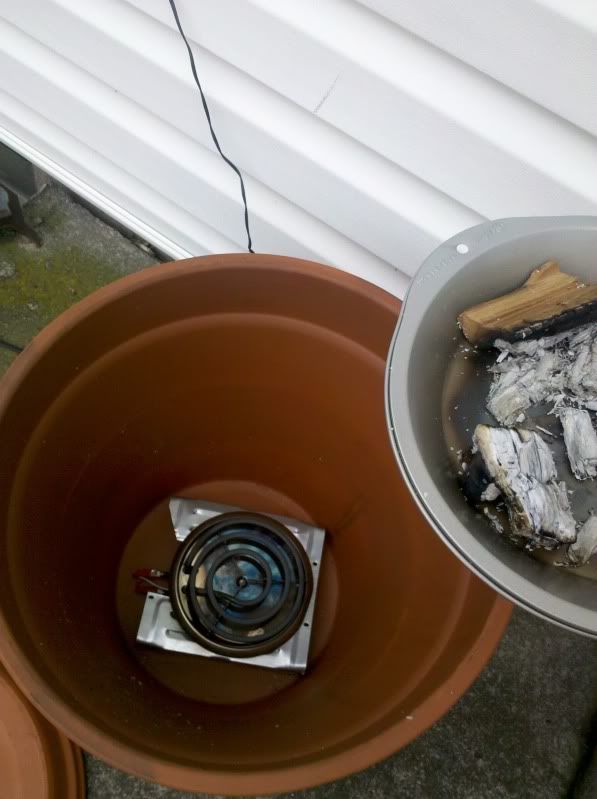 little late in the season, but i've begun building my own bbq smoker out of a huge terra cotta flower pot. basic components are a hot plate, pan, grill rack, terra cotta pot, and some sort of lid (im using a pot base). here's some pics of it in progress, haven't gotten anything cooked yet as im trying to work out some issues.
