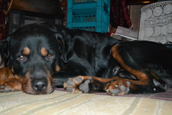 @der affe, I love my rottie! they are such amazing loyal dogs. This is the family dog, he is a German pure that is 14 years old. He is too tired and old to be moving about =( In their older age(owned two now) the hips give out and they have trouble moving about. He still thinks he is two though! In his prime he was 197lbs!