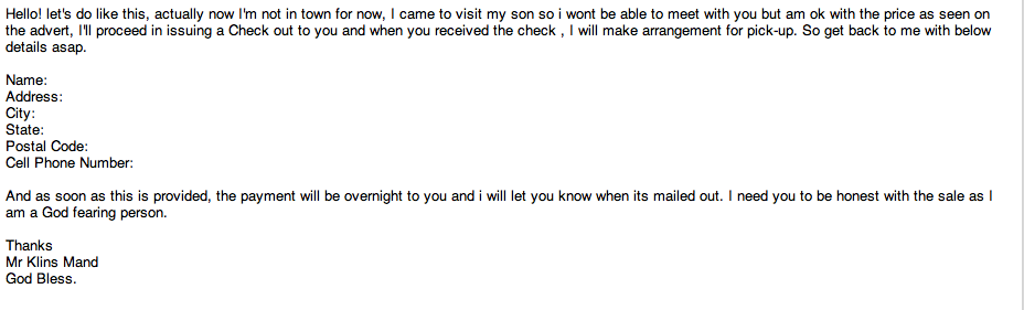 I've done some great business with some cool people through the forums and craigslist, but this response just begs to be fucked with.