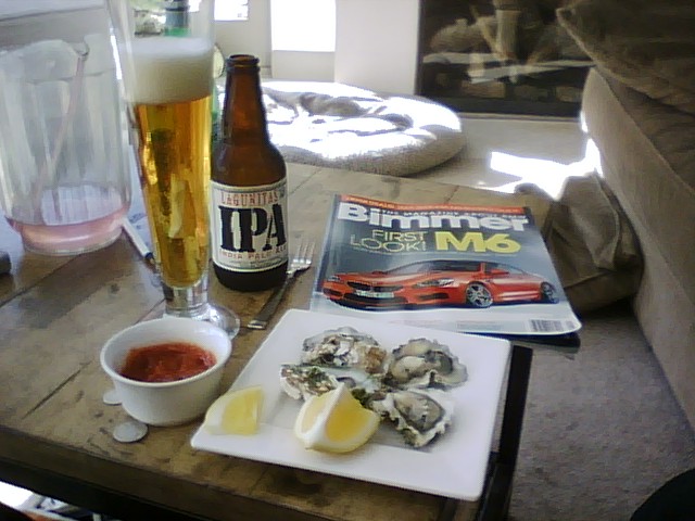 Costco hot dog, grilled, sliced in half with bacon bits and provolone. Oh, and a S1nistor Black Ale.