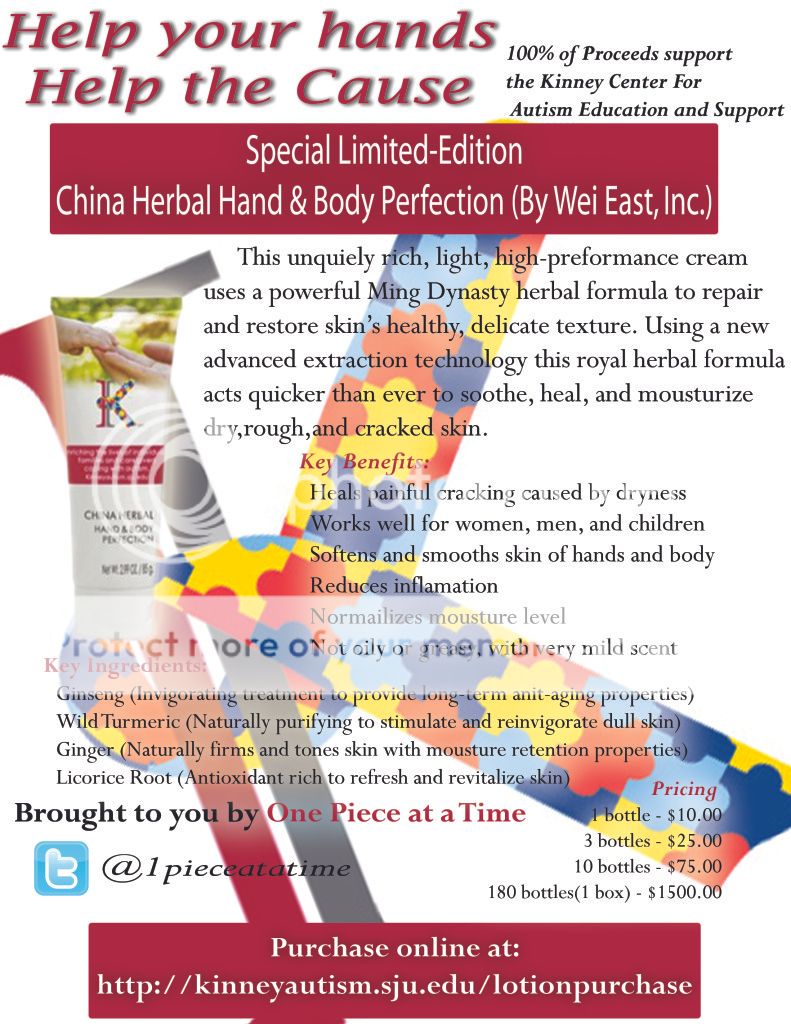 I come to you today to ask for your generosity, my University's Autism Awareness center (http://kinneyautism.sju.edu/) holds sale once a year to raise money and spread awareness. To do this we sell hand cream donated by Wei Brian who has felt the affect of autism through her son, Alex. Any donation will help. PM me with any questions about the cause and if you need any help purchasing or making a donation.