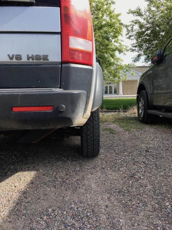 Luckily this dinky Continental mini spare got them home. He decided to get a full set of BFG E range A/T's, get a used steel wheel in 18", and put the best old tire on there for a spare. It hoists up under the back floor with a little hand-crank winch from inside. It'll hang down a bit more, but then you've get a real tire if you're stuck somewhere.Comment