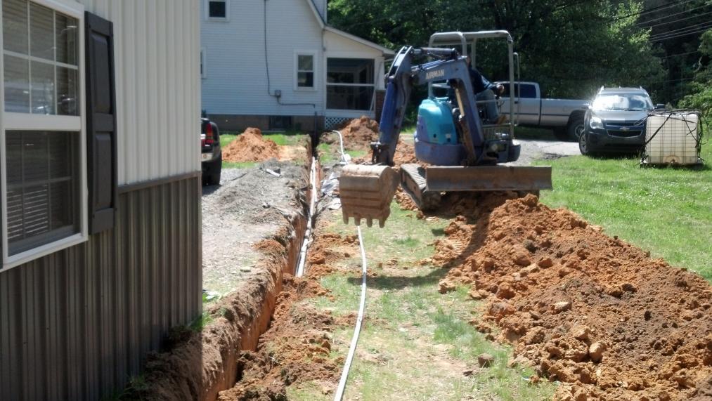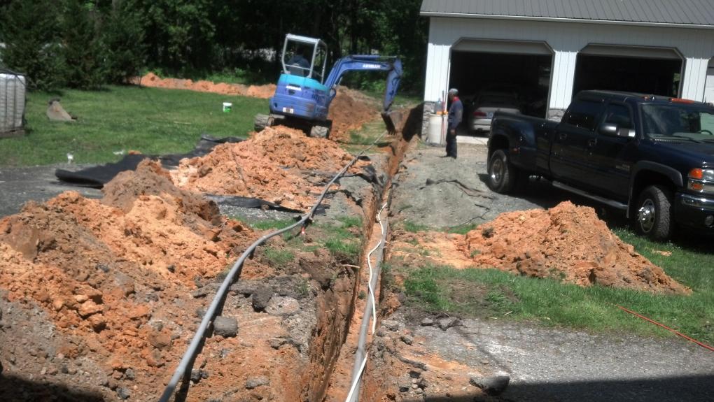 Saturday morning was reserved for a two and a half hour ride to chriskbmxs' house, a member here, I was supposed to pick up my hood and some bumper trim. Instead I spent the morning with my brother and stepfather working on the garage. I have been wanting to put electric and water in now that I have my c.o. and today was the day we started. My father brought over his mini-excavator, and his operator friend came over too. We trenched from the telephone pole to the garage and from the garage to the house. We laid conduit for electric 2 1/2", fios cable and (telephone if I ever wanted)1 1/2",and we also laid a 3/4" line of pex pipe for water. Everything is backfilled and tamped with a jumping jack.