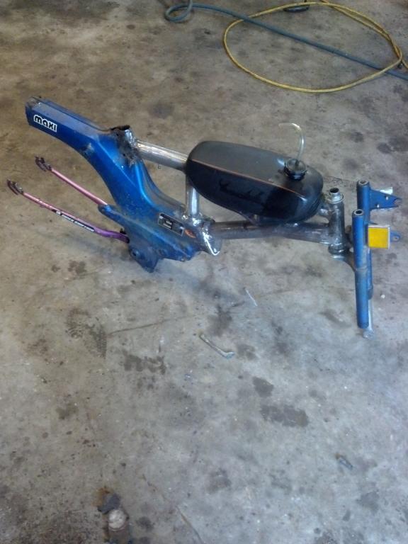 I now have to wait on the forks to get in to place the tank with the handle bars. Other than that I have just a swing arm to make. Waiting on someone to sell the Puch Magnum swing arm, it is perfect and just needs to be extended 6" for the mean look.
