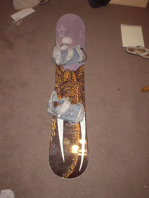 Rossignol Sultan 166 w/ Lamar MX200 bindings. Got the board at a consignment shop. The guy rode it for 2 months and didn't like it. $400 board, I got it for $115.