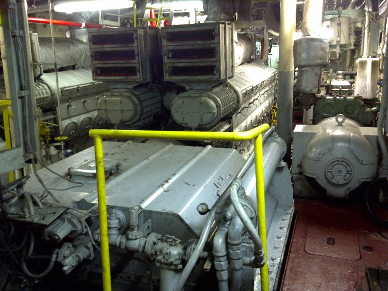 Rear of the engine coupled to reduction gears. On right out little detroit diesels for power generation.