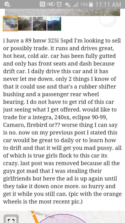 I wanted to post this in the CL thread. I really REALLY wish I had a screen shot for the original add. He stated in the original 'can't shift gears cause too many chicks in the car' kinda thing.