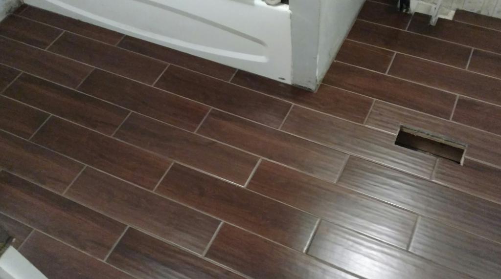 Got the floor down, but I screwed up and learned a lesson in grout. I think I cleaned it too soon and used too much water, it lightened up pretty bad after this photo, everywhere except the corners where I didn't mess with it much. Picked up some Aqua mix seal n enhance yesterday and tried a spot, seemed to help out some. Going to seal it all tonight and hope for the best. If I can't deal with it, I guess I get to cut it out and try again.
