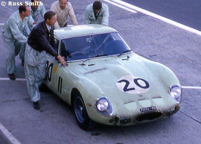 I forgot this little trivia, that they had to be licensed, since they were sports cars with lights and two seats and a trunk. This is a famous GTO, but light colored...? Could it be that pale green Phil Hill GTO?