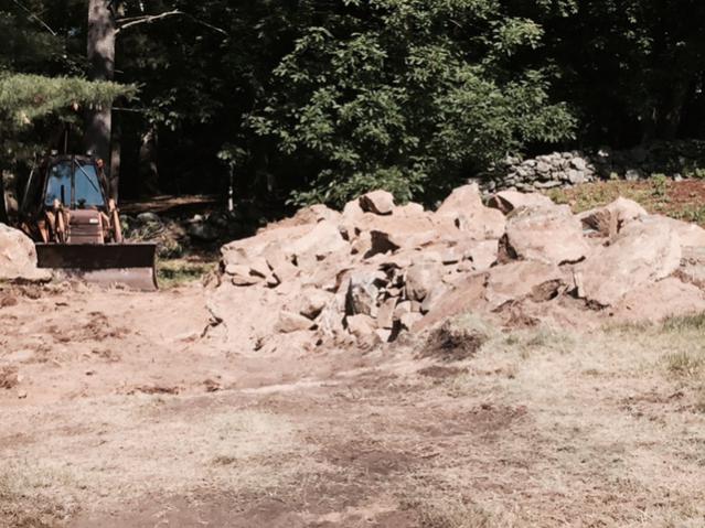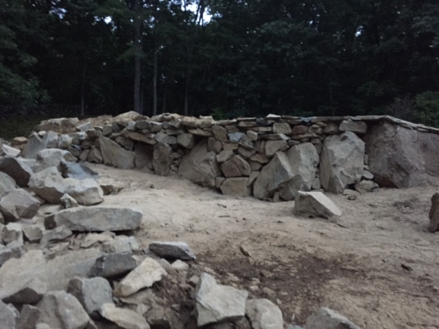 During the excavation we dug up more rocks and ledge than we knew what to do with. I had enough rock to build a 63' long x roughly 4' high wall (with a radius) and still have a huge pile left over.