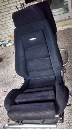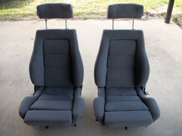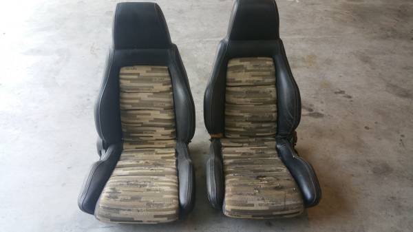 I was going to use this pair of seats in my jeep but I think they are too nice for that. I'm not sure what they originally came out of but these seats were used in fast and high end cars in the late 80s and early 90s. These have the rare hollow headrest with netting. They also have a flip forward function for use in 2 door vehicles. These also have the adjustable leg bolsters (they pull out). They do not come with sliders. The passenger seat is in very good condition. The driver seat is in good condition with one hole on the side of the bolster and the seat bottom support (underneath the foam) is ripped (you can buy aftermarket replacement parts for this or fix it with standard seat webbing). $600 for the pair.