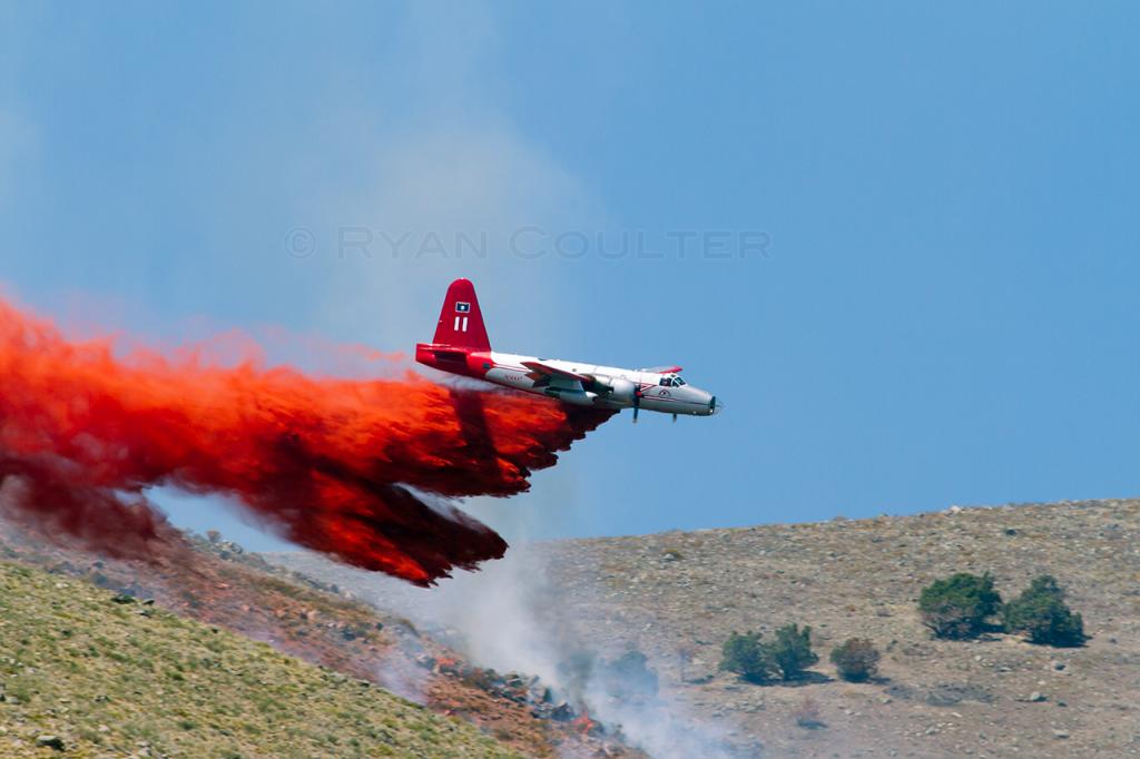 I was just about to pack up and head home when I heard the unmistakeable rumble of a pair of R3350s approaching out of the smoke. A few moments later T43 came in from Sacramento, made a slight right turn and made a pass down the back side of the ridgeline. He orbited a few times, dropped the last load and headed back to Sac.