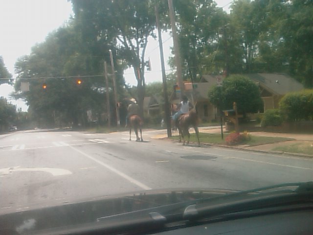 This is a pic taken less than a mile away from Downtown atlanta on Hoseia Williams and Moreland avenue. These are two of The Black Cowboys. They are a group of guys who have ancestry to some of the first black cowboys in the south. they live in the Kirkwood East Lake area and can be seen fairly frequently around town on their horses. They have "hitched" their horses to bars in the area for years and are very cool to talk to. It is weird rolling down a main road in the city of Atlanta, and seeing them, but pretty darn cool non the less.Yours truly,