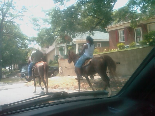 This is a pic taken less than a mile away from Downtown atlanta on Hoseia Williams and Moreland avenue. These are two of The Black Cowboys. They are a group of guys who have ancestry to some of the first black cowboys in the south. they live in the Kirkwood East Lake area and can be seen fairly frequently around town on their horses. They have "hitched" their horses to bars in the area for years and are very cool to talk to. It is weird rolling down a main road in the city of Atlanta, and seeing them, but pretty darn cool non the less.Yours truly,