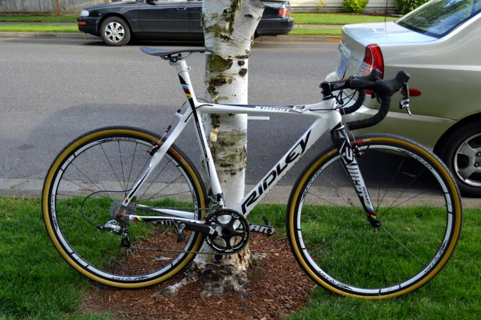 In that photo I was using Mavic GP4 rims (laced to Campy Record Pista hubs) and Tufo tubulars, but I ended up with Sun M13s and Veloflex Master tires: