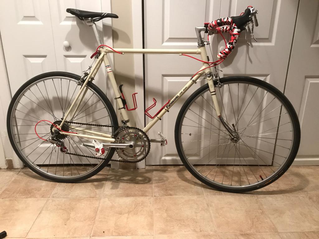 My son was looking to get into road biking, so I fixed up an old mid-70's Panasonic as a starter. It’s still a mid-1970’s 10-speed on a mass market Japanese steel touring frame, but it works and looks much better now. The Shimano drive train is pretty bullet proof. Component list: Shimano Tourney double Crank, Look Delta Clipless Pedals, Original Shimano 600 derailleur (r), Shimano 50 deraileur (f), vintage Dia-Compe center pull brakes, modern Gevenalle Audax shifting/braking system with Dia-Compe friction shift levers, 3TTT handlebar, SR Stem, Sovos Hubs on 27x11/8 rims, Continental UltraSport tires, Cateye Strada wireless computer, Selle Italia X1 seat. Basically it is set-up kinda like a CycloCross bike but with a longer touring wheel-base, road tires & a few plush comforts. I think it’s pretty cool.Comment