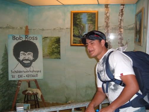 My cousin in front of a Bob Ross exhibit in the basement of the Rotterdam train station -talk about random