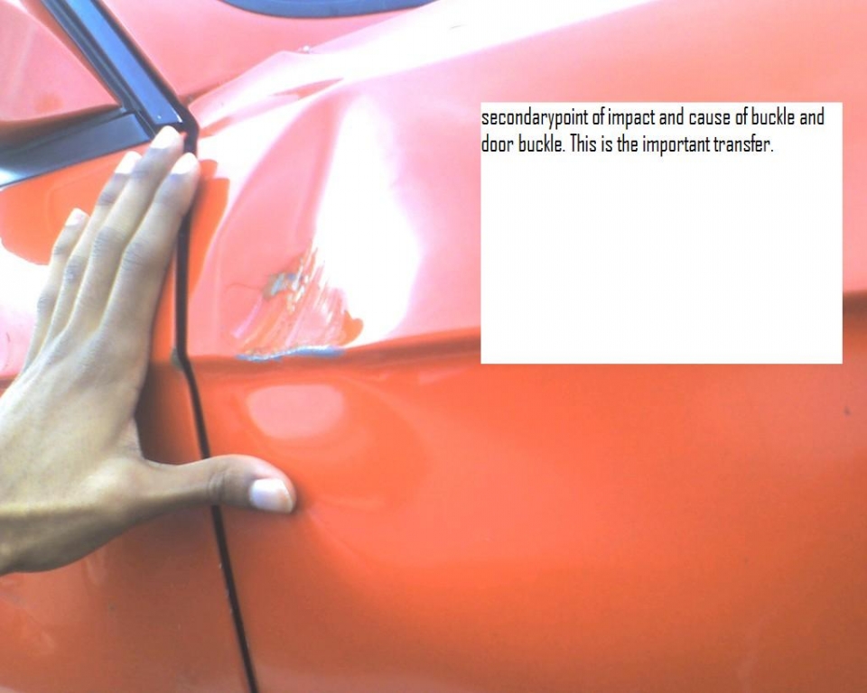 I am unsure if you had ant front end damage before this but if you did not here is what I see. The initial impact came to the front feder just above the bumper, causing the body wrinkle and the impact crease. Also it tore away the fender from the mounts (that is way beyond human force). Then the person pulled away and backed into the car again more likely than not in an attempt to make a hasty get away (drunk). The second impact carried the pressure from the fender accross the body gap and contacted the door skin causing the wrinkle inthe door skin (very easy to wrinkle the door skin)