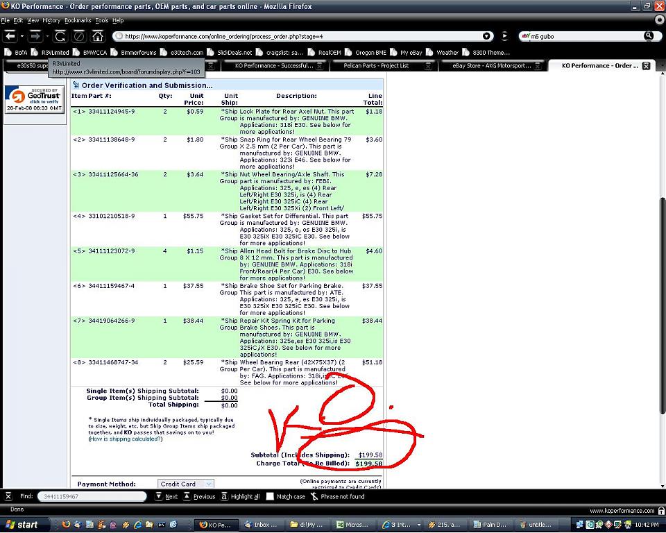I like pelican parts, been good to me in the past and ship from the west coast, but I wanted to see what the hype was about KO performance. So here's the comparo. Everyday part order, nothing trick or special, just the nickle and dime crap that bleeds e30 owners dry. Surprisingly similar in price, with a slight edge to KO. Plus since we all like erick, I'll pull the trigger in a bit (after he PM's me a discount code for some free advertising, hint hint).
