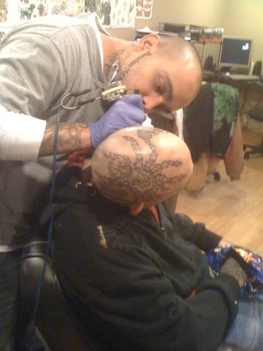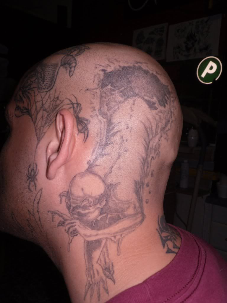 started working on my head...did the crown/hairline section the other day..went with some ST script...ive got the back and the sides done..but just trying to pull it all together and work on my car at the same time ahahah