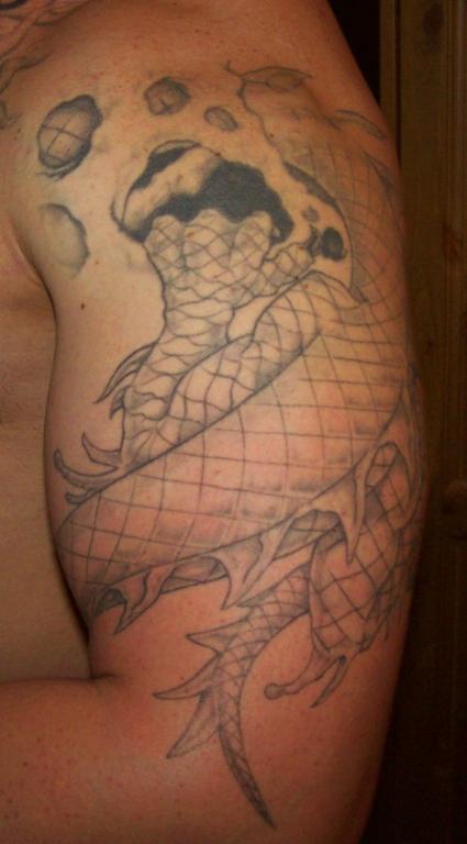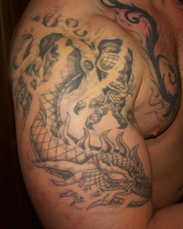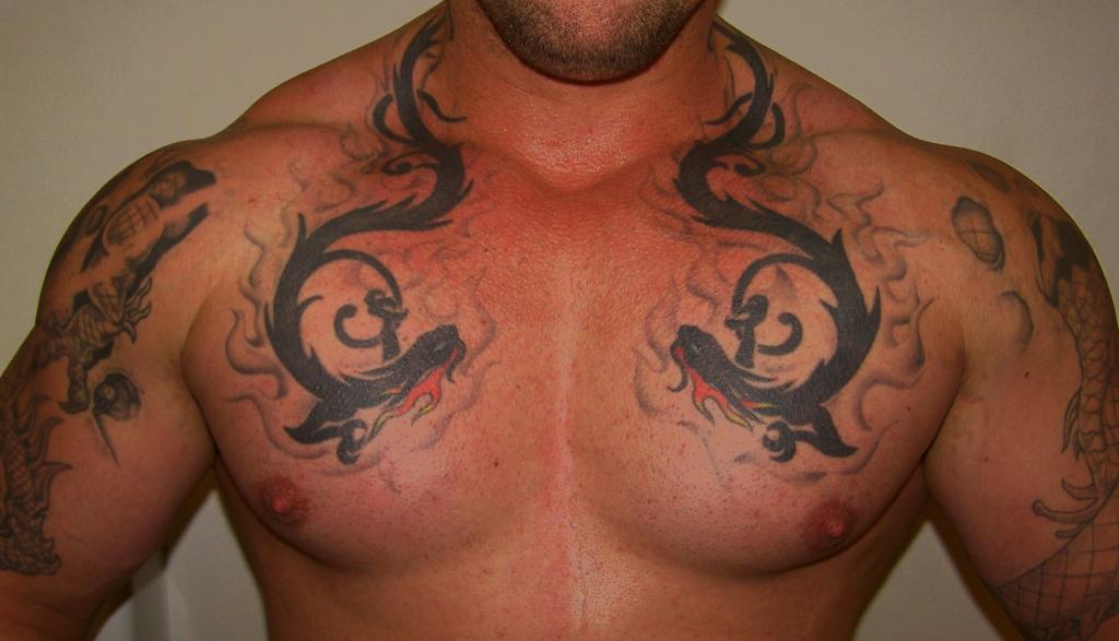 I'm in the midst of drawing this, in monocromatic shading. It's filling the area from each nipple to my collar bone. "Laudir Agus Mir" going across my collar bone. It means swift and strong in Gaelic.