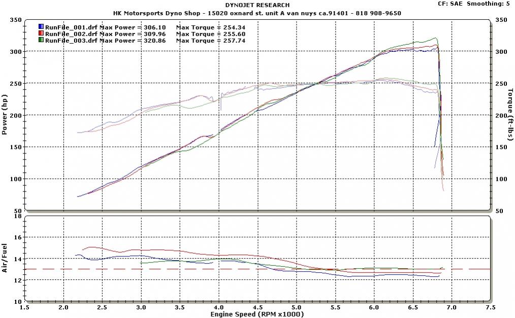 About 30 minutes later I went down the street and ran on a DynoJet 248. I pulled a high of 320 RWHP SAE corrected. It was about 90 degrees still. 3rd gear pull to 6900 RPM.