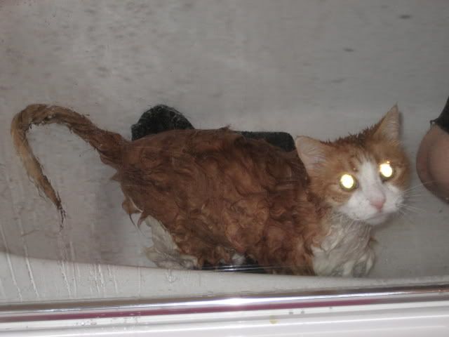 We ended up giving them all baths. I bathed all the cute little pusslets. They were all really cool about it unless they dipped their noses under which would freak them out. After I'd washed and dried them she brought the shitty piss covered waffleswaffleswaffleswaffleswaffles in.....she had it in her hands and tried to dip it in; bad idea. She got torn to hell. My gf then wrapped it in a blanket and tried to dip it. She got it in the water but then it would leap up like 3 feet in the air with super satan power even though she was still holding it wrapped in a blanket and trying to dunk it. We never got the thing cleaned nicely like the kittens. All we were able to do was dunk it a bunch. What does it do after we finished and placed it back in the room with the pusslets? It goes into it enclosed littler box and cowers in the corner in shit.