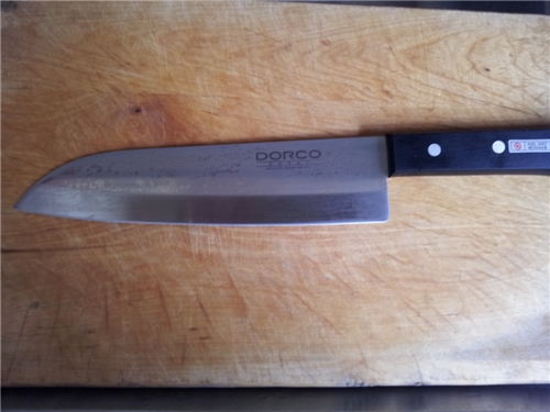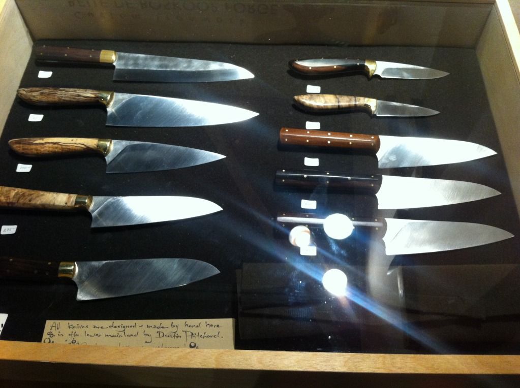 This thread needs more kitchen knives. I cook for a living and here are some of my knives. Starting on the left are some home knives: F. Dick 6'' flexible petty knife (culinary school issue), 8" Shun Classic, 9" F. Dick Competition (school issue), Mac ceramic sharpening rod. My work stuff: Idahone ceramic rod, 270mm Hiromoto AS Gyuto (my favorite - it is carbon steel clad with stainless, which is why it has a crazy looking edge - it has the benefits of both types of steel and is in general super badass), Global 7" single-beveled, F. Dick tourne knife (AKA bird's beak/raptor claw). On top are my stones: 120 grit Peacock leveling stone, Shun 300#/1000# combo, Arashiyama extra wide 6000#, and a nagura stone.
