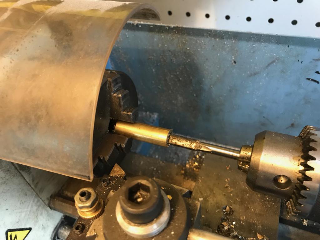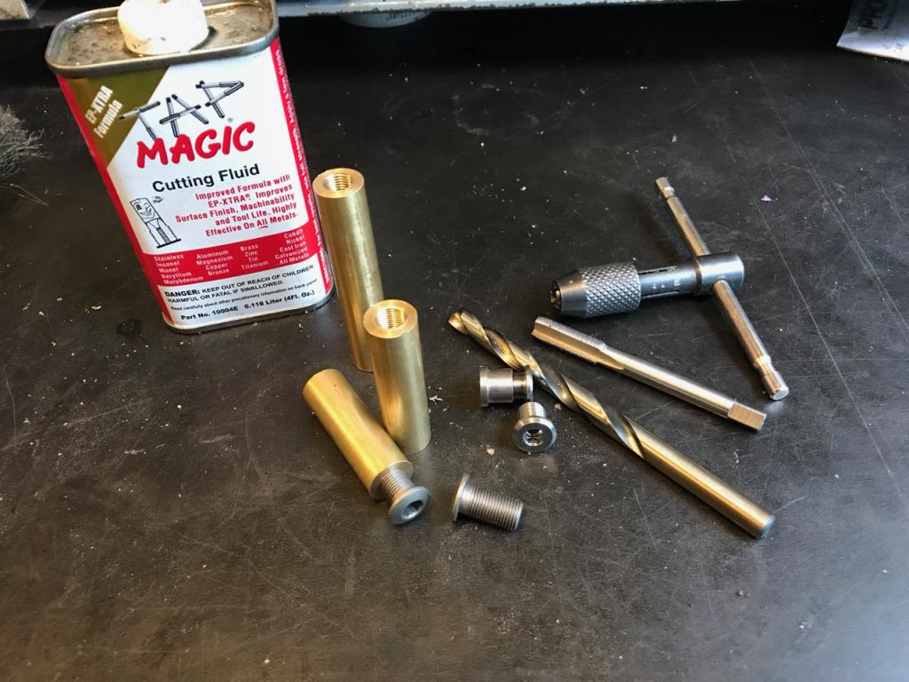 I felt like a shop chopper should be heavy and balanced, so I wanted copper liners for the scales to offset the blade weight. First, I had to make brass threaded inserts to mount the scales. Did this with my bench lathe and some hand tools. Then cut some copper sheet to fit the handle. Scales will be a nice jade-colored G10 material. When the copper oxidizes, it should match nicely.