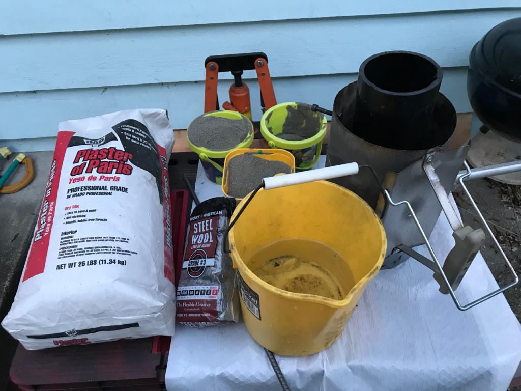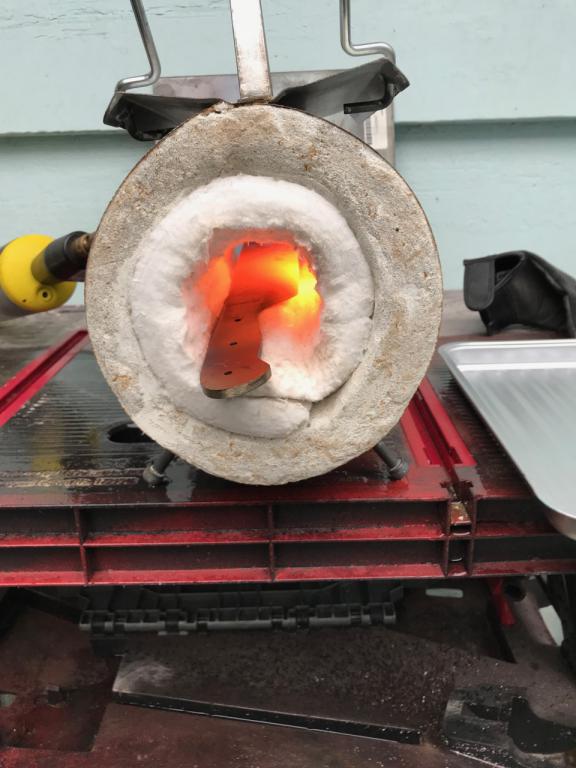 The blade has to be heat-treated, so I made a forge out of an old charcoal chimney starter, bolted on some screws for legs, lined with mixture of plaster and sand, insulated with fiberglass furnace matting. Fired with a butane torch. Quenched in some old cooking oil. Then tempered in a cheap toaster oven I bought on Amazon just for this purpose.