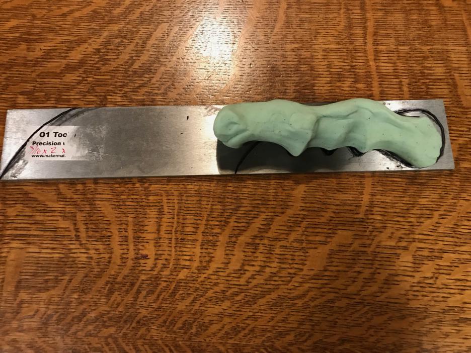 Took some home-made clay, and squeezed it to shape a grip. Cut the pattern on the steel using my band saw and bench-top mill with a carbide burr. Decided I like the look and feel of thumb jimping on the blade spine, so I cut those on the band saw as well. That other blank is another blade I was making simultaneously, experimenting with a Wharncliffe type blade.