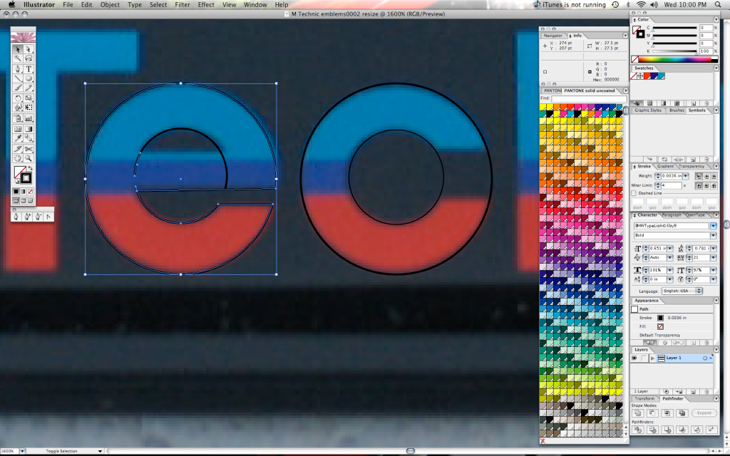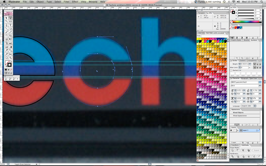 Upon closer inspection, I found that one of the reasons the re-created versions up to now don't look right because of the rounded lettering. Helvetica's lettering in the circular forms do not match up no where close. I had to recreate the "e" and "c" with actual circles, then cut some points off the circles and re-joined them to make the individual letters. The tail on the "e" doesn't actually line up with the corresponding tail of the "c" either as you'll see below. Also done with the "n" and "h". The hump on those letters is actually a bezier curve at the top and a circle cutout below. Here's what I mean.