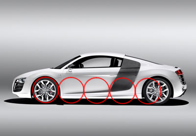 You can see the front and rear wheels are over four diameters apart. I can almost guarantee you the original Audi sketch for the R8 did not have the wheels 4 and a bit diameters apart. This is called cheating the sketch. Basically altering the plausibility of the concept to allow for a more exciting image (bigger wheels, lower ride height, chopped roof, no tires etc..). Don't be afraid to use a bit of artistic license, but don't go overboard.