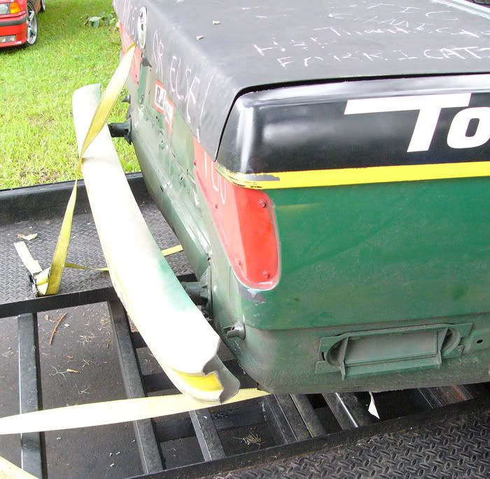 We also ran a 2 inch flat steel strip behind both bumpers. Since we were seeing the bumpers getting hooked on other cars and being pulled off. We drilled holes in the steel where the stock mounts were. Then also drilled a few new holes and bolted the Aluminum bumper to the steel strip in a few places. This worked well. We have not lost a bumper. but they have been twisted. You can sort of see the buckeing in the rear vance. But the cage kept the body in tact.