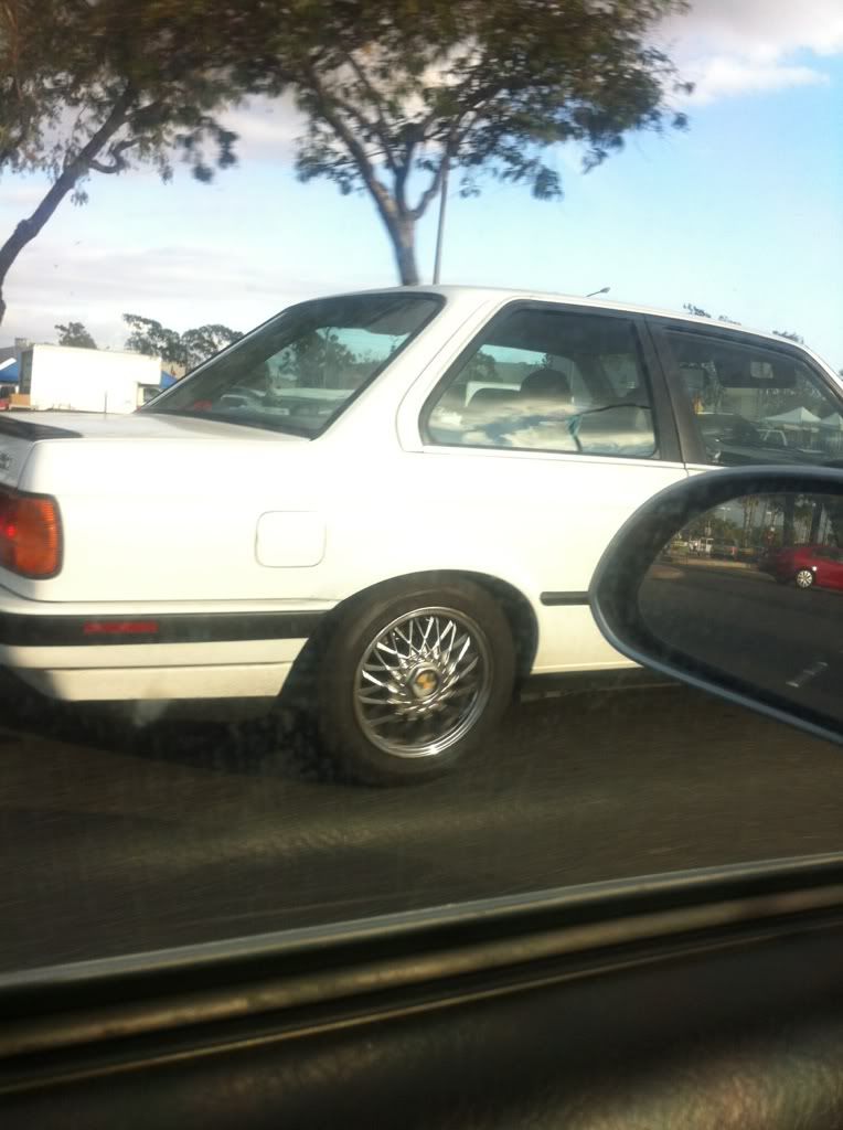 Spotted another alpine white 318i on Redondo Beach Blvd. around 10 am today. Lowered on stock weaves and it had a roof rackkkakakakaka.